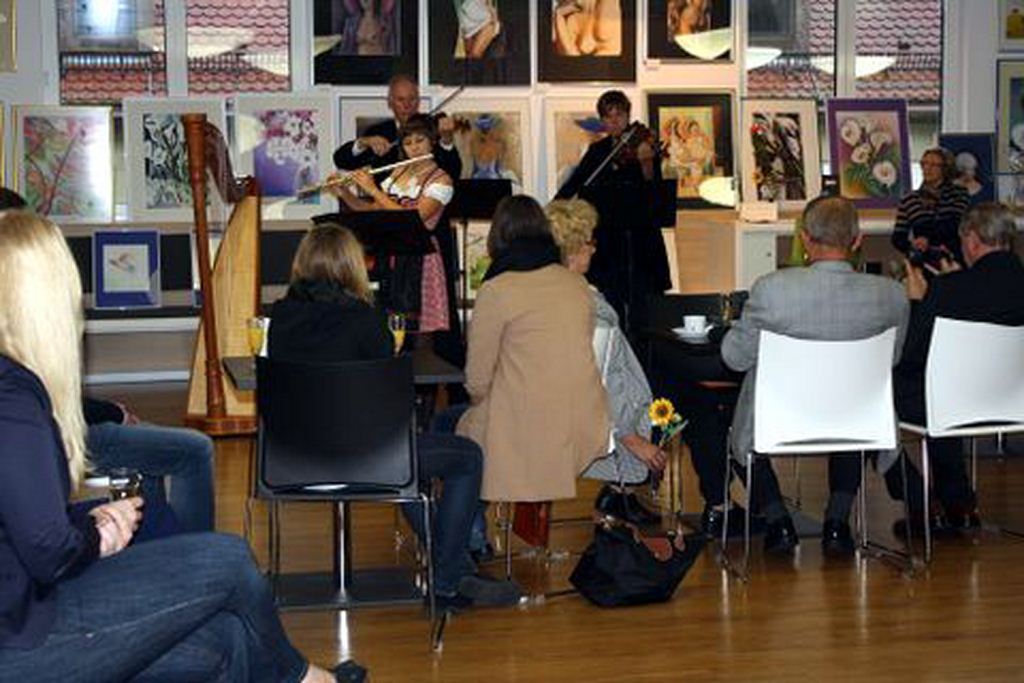 Nicht nur als eine musikalische Umrahmung diente während der Vernissage die Darbietung von Lewandowski – Trio aus Bamberg. Boguslaw und Zazie Lewandowski, Mitglieder der Bamberger Symphoniker ( Geige und Bratsche), Friderike Lewandowski, Harfe und Flöte fesselten die Besucher mit ihrer einfühlsamen, virtuosen interpretation von deutschen und polnischen Komponisten. Diese Interpretationen wurden viel mehr zu Träger der Ausstellungsaussage : “ Deutsch, oder Polnisch ? Die Kunst ( gleich ob Musik oder Malerei ) erreicht uns in jeder Sprache“.